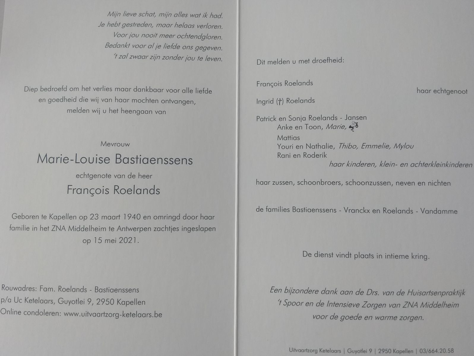 De moeder van medebestuurder Patrick Roelands overleed op 15 mei ll. Samen met haar echtgenoot François volgden ze Patrick toen die in begin jaren 80 de overstap maakte van Antwerp Atletiekclub naar AK Ekeren. Ze engageerden zich al snel voor de clubwerking, en terwijl François vanaf begin jaren 90 de ‘nieuwe’ piste aan het Schindebad pikfijn in orde hield, nam zij een paar jaar later de verantwoordelijkheid voor de kantine op zich. Ook op de Ekerse veldlopen was ze altijd paraat, om van ’s morgens vroeg broodjes te smeren voor de medewerkers.