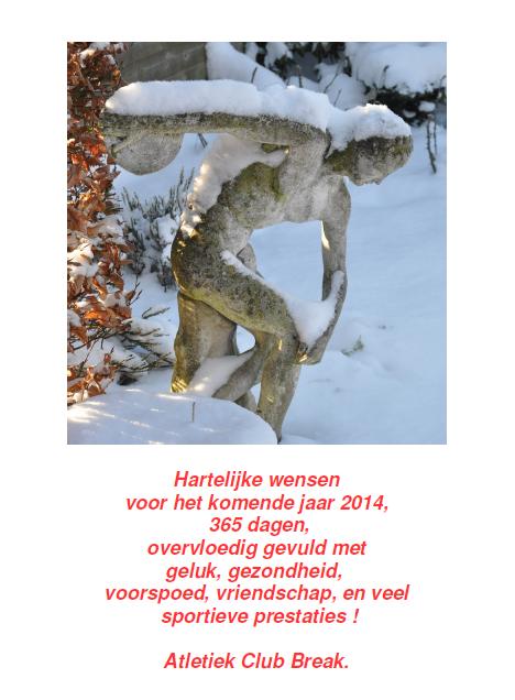 Op vrijdag 10 januari organiseert AC BREAK haar jaarlijkse nieuwjaarsreceptie in het Louis De Winterstadion in Brasschaat, om 20u00. We maken van de gelegenheid gebruik om de opvallendste momenten van het voorbije jaar te overlopen, de verdienstelijke atleten vanaf cadet te huldigen en het programma van 2014 voor te stellen. Maar bovenal blijft dit een gelegenheid om samen van de prestaties van het voorbije jaar te genieten en plannen te smeden voor het nieuwe jaar.